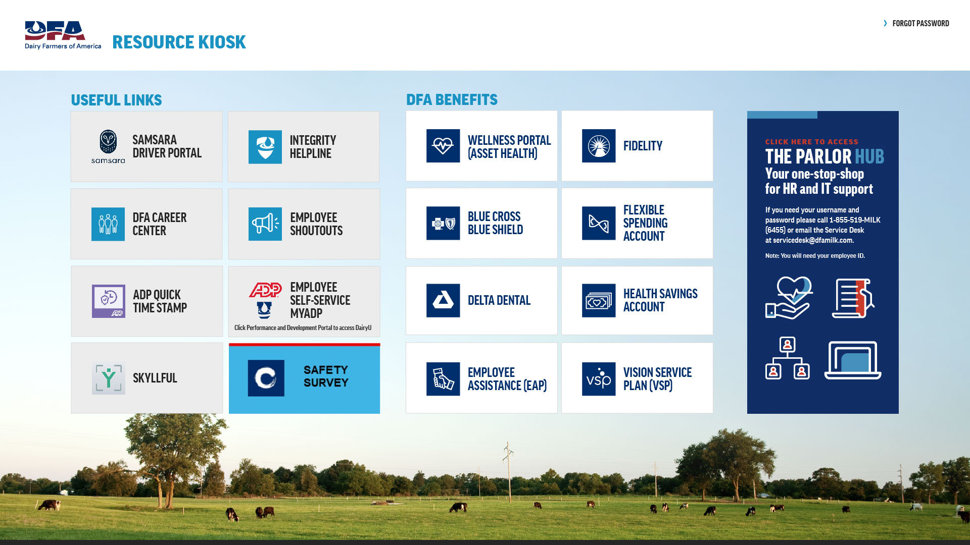Samsara Driver Portal DFA Career Center ADP Quick Time Stamp Integrity HelpLine EmployeeShoutouts ADP Employee Self Service Skyllful Wellness Portal Blue Cross Blue Shield Delta Dental EAP Fidelity Flexible Spending Health Savings Account Vision TheParlorHub Forgot Password Safety Survey